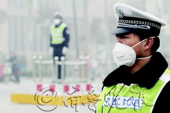 2月27日,聊城市区被雾霾笼罩,在兴华西路与昌润路交叉口,交警戴口罩执勤。据了解,由于雾霾天气对户外工作人员的身体伤害较大,全市一线执勤交警统一配发口罩,并允许在雾霾等恶劣天气时佩戴口罩执勤。
