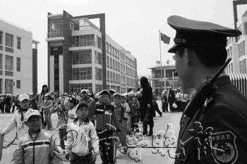 随着各所小学正式开学,青岛开发区警方启动爱心护校活动,在加强对校园周边巡逻力度的同时,护送学生们上下学,严防侵害学生安全的事件发生。图为27日,青岛开发区民警护送小学生上下学。