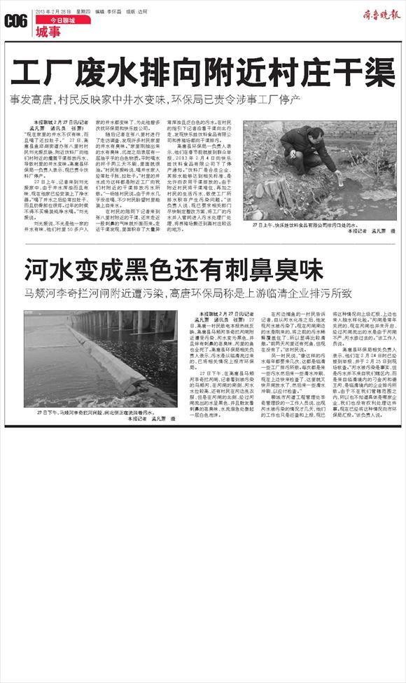 工厂废水排向附近村庄干渠