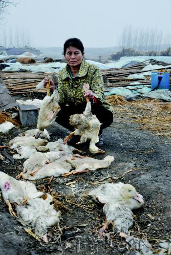 | 丈夫徐炳建指着大片已经垮塌了的鸭棚。 |  | 董春香在成片死了的鸭子前。 |