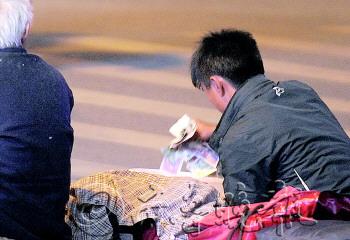 文/本报记者 王光营 张子森 实习生 周媚 吴起 片/本报记者 戴伟 连日来,很多济南市民在历山路历下大润发附近都见过这样一幕:两个年轻人给两名老年乞讨者喂饭、喂水,很多人因此被感动。但记者调查发现,这些乞讨者至少有9个人,他们对外号称是一家人,实际上是一个职业乞讨团伙,靠“演戏”博取同情心。 变形一 街头瘸腿乞丐 被指走路利索 “以前只听说过,没想到竟亲眼看到这么有爱心的人。”14日中午,市民孙女士在历下大润发附近十字路口东侧看到两个年轻人给两名年老的乞讨者喂饭,非常感动。 记者随后来到该十字路口时,两位老人仍在乞讨。一位留着齐耳短发、身穿红衣的女孩正蹲在一旁给老人喂水,见记者走过来她匆匆离去。 两位老人也重新跪卧在褥子上。跪着的老太太不停说着“谢谢”,老汉则躺在被子里。他们前面摆了一个白色塑料桶,里面放着一沓零钱,桶旁边有一沓“出院记录”。 “他是我公公,腿瘸了,我眼睛瞎看不见。”乞讨老太说,他们是从安徽来的,前天坐火车到的济南,晚上睡在火车站。但自称双目失明的流浪老太,却向记者准确地指了指放在地上的出院记录。而附近一位环卫工人则介绍,躺着的老头腿脚根本没有毛病,自己过马路很利索。