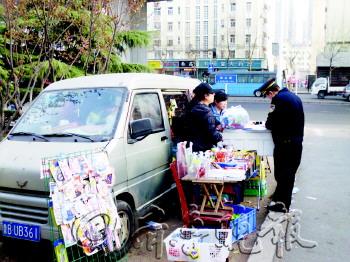 16日,在鞍山路小学附近,一女子在面包车旁向学生售卖学习用品和零食被举报,市北城管予以查处。如车主再次摆摊占路经营,执法人员将强行将车辆拖走。