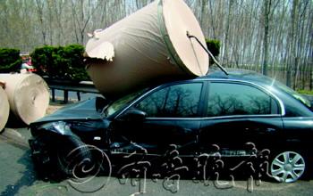 本报4月21日讯(记者 王琳 通讯员 王少丽)超车时没有计算好距离,小轿车撞上了前方一辆满载货物的大货车,被货车上掉下的一捆捆巨大卷纸筒砸得面目全非。18日上午,青银高速公路上发生了这样惊心的一幕,所幸事故无人员伤亡。 18日上午8点50分,青银高速高密交警大队接到报警称,在高速公路青岛方向113公里处发生一起事故,一辆大货车上掉落下来的货物洒落一地,影响其他车辆通行。大队民警赶到现场后看见,一辆重型大货车骑压在中央护栏上,车子周围散落着二三十捆卷纸筒。这些纸筒直径都有两米左右,横七竖八地躺在地上,有的纸筒已经破了,破碎的纸张将二十多米的路面铺盖了起来。 距离货车十米左右的地方,有一辆黑色的小轿车,车“前脸”被一捆卷纸筒砸个正着。前挡风玻璃全碎了,车顶也被压得变了形,车门和轮胎都受了伤,整个车“前脸”已经面目全非。据轿车司机说,事故发生时,他正行驶在行车道上,想要超过一辆在快车道上的大货车,但他没想到,超车时距离不够,自己的车辆碰到了大货车。货车司机紧急刹车,结果车上拉的卷纸筒都因为惯性滚了下来,其中一个不偏不倚,正好砸在了他的前挡风玻璃上。本来刮擦事故中黑色轿车的“伤势”并不重,但是经卷纸筒这么一砸,整个车“前脸”都被砸烂了。 据了解,事故中没有人员伤亡。随后,交警对轿车司机的违法行为进行了批评教育,并协助清障部门及时清理了现场,恢复交通。目前事故正在进一步处理中。