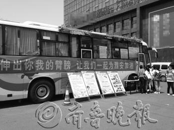 | 21日,献血车上的这条横幅,将日照与雅安紧紧相连。 本报记者 彭彦伟 摄 |  | 李雪莲(左)说:“献血也算是向灾民献点爱心。” 本报记者 彭彦伟 摄 |