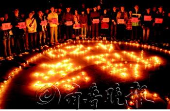 21日晚7点左右,山东理工大学500多名学生在西校区艺术广场上为雅安祈福。学生们手举“雅安加油,我们的心永远在一起”的标语,通过点蜡烛、默哀等方式为雅安加油、为灾区人民祈福。 本报记者 姜文洁 摄影报道