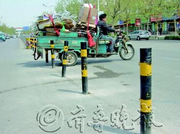 | 受损的隔离护栏全部更换一新,但时常有三轮车经过,部分新护栏又现刮蹭痕迹。 本报记者李璇 摄 |