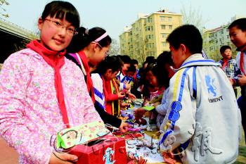 4月27日,在宁夏路小学的操场上,学生、老师和部分家长拿出闲置的玩具和书籍义卖,所得钱款将全部捐给雅安地震灾区。