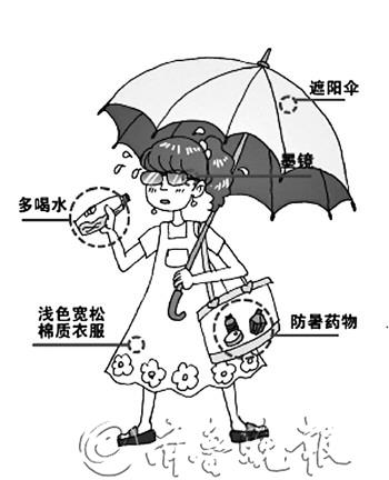 一、躲避烈日。应避免上午10点到下午4点这段时间在烈日下工作或行走,这个时间段发生中暑的可能性是平时的10倍! 二、遮光防护。在烈日下进行露天作业要戴草帽或戴太阳镜等遮阳护品,长途行走应打遮阳伞、戴太阳镜、涂抹防晒霜等。 三、补充水分。养成多吃新鲜蔬菜水果和及时饮水的好习惯,不要等口渴了才喝,一旦口渴表示身体已经缺水了。 四、充足睡眠。夏天日长夜短,充足的睡眠可使大脑和身体各系统都得到放松,是预防中暑的好措施。 五、增强营养。多吃高维生素的膳食,多喝番茄汤、绿豆汤、豆浆、酸梅汤等。 六、备好防暑药。工地或车间应备好防暑药,最好随身携带,如十滴水、藿香正气水、清凉油等。一旦出现中暑症状即可使用,缓解病情。 七、适时查体。提倡暑期来临之前进行一次健康体检。凡发现有心血管系统器质性疾病、持久性高血压、肺气肿、肝肾疾病、中枢神经系统器质性疾病、重病后恢复期及体弱者,不宜从事高温作业。