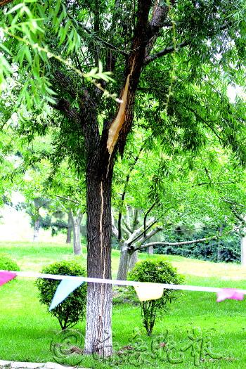 | 高压线突“放电”劈坏一棵柳树 |