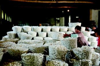 | 西湖镇蚕茧收购站,入库的蚕茧堆积如小山。 |  | 蚕农开着手扶拖拉机到茧站卖茧。 |  | 工作人员将新收的蚕茧推进风干炉内进行风干。 |