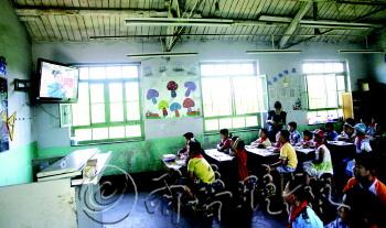 | 20日,在王亚平的母校烟台张格庄完小,孩子们通过电视直播观看她的太空授课。 本报记者 赵金阳 摄 |