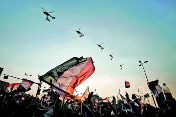 | ◤7月4日,埃及军方直升机悬挂着国旗在开罗解放广场上空飞过,下方为庆祝穆尔西下台的民众。 新华/法新 |
