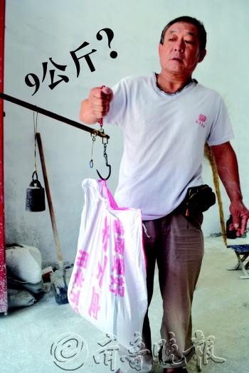 | 李先生购买的袋装腻子标注净含量18公斤,实际却只有9公斤。本报记者 赵伟 摄 |