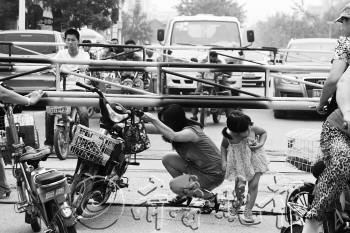 22日15时30分左右,新湖南大街的铁路货运专线升降栏杆因出现故障,拦住了过往行人。图为被阻拦的市民钻栏而过。 本报记者 王小会 李明华 摄影报道