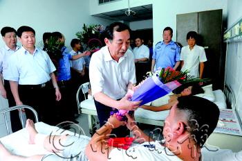 22日,受菏泽市委书记于晓明委托,菏泽市委常委、政法委书记李法洪来到巨野县人民医院看望勇斗歹徒负伤的协警解昂昂和赵之刚,分别为两人送去10000元慰问金,并勉励他们好好疗养,同时嘱咐医院负责人要给予精心治疗,争取让两人早日康复。 本报记者 李德领 通讯员 王有方 摄影报道