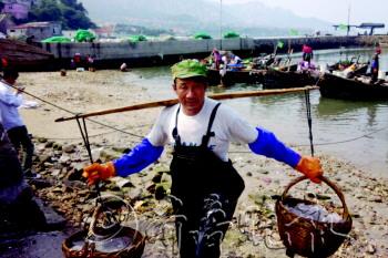 | 张志信挑着满筐的海蜇上岸。 陈之焕 摄 |