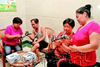 | 市民们展示刚刚领到手的摄像机,他们将用它留下家人的珍贵影像。 |  | 大家在工作人员的指导下学习操作摄像机,这部摄像机简单易操作,几分钟就学会了。 |