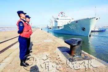 | 我海军舰艇编队出访美国、澳大利亚、新西兰三国。图为8月20日,综合补给舰洪泽湖舰驶离青岛港码头。
