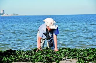 19日,在幸福公园岸边,两位市民在岸边打捞海菜晾晒。据其中一位市民介绍,这些海菜在海里没有什么价值,但自己晒干后可以喂养家中的禽类,让海菜变废为宝。
