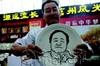 刘春江展示自己在瓷盘上刻的作家莫言。 本报记者 刘涛 摄
