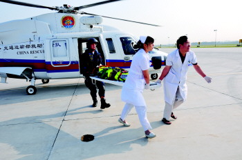 7点51分,直升机在烟台莱山机场降落,机组人员与医生一起将伤者转移到在此等候的120救护车上。
