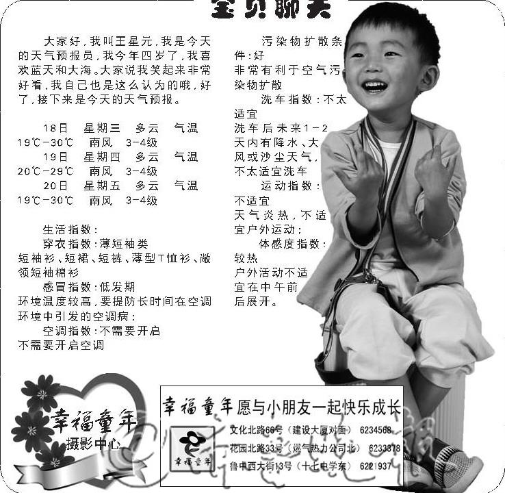 宝贝聊天 大家好,我叫王星元,我是今天的天气预报员,我今年四岁了,我喜欢蓝天和大海。大家说我笑起来非常好看,我自己也是这么认为的哦,好了,接下来是今天的天气预报。