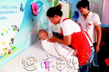 | 育婴店员工给孩子做护理。 |