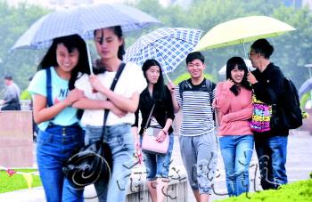 | 23日,济南泉城广场,前面两个女孩身穿短袖走在雨中,冻得瑟瑟发抖,而后面的一个女孩则穿上了厚厚的毛衣抵御寒风。 本报记者 王媛 摄 |