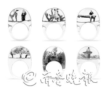 来自香港shannnam的设计师duo chan oi yau riyo和kwong ho sun howard设计的“fragmented chronicles”。这个系列由100枚戒指组成,每个戒指里面都设计了一个人造微型景观,而且都包含不同的主题,从充满童趣的元素到雪地里的修女,从带手提箱行走的女人到牧羊人和羊。每枚戒指都是一个小故事,它能激起人们的想象力和回忆。