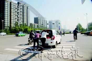◤26日上午,在三八东路与广川大道路口,一辆电动汽车断电失去动力,车主不得不下车推车前进。