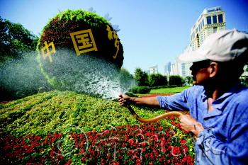 26日,在东海路与福州南路交叉口,数万盆鲜花搭起“中国梦”。