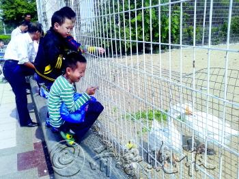 | 广场鸽笼里的“新住户”很受小朋友的喜爱。本报记者 范少伟 摄 |