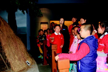 第三站“城市幸福快车”重点培养孩子们回馈社会的志愿精神。对展览的内容有了一定了解后,有的小朋友想要体验一下讲解员的工作,为同学和其他游客讲解。在古人类活动场景前,五年级的温朝政第一个接过话筒:“青岛地区古人类居住的茅草屋建于土台之上,饮食中已经有烤鱼,显示了青岛的滨海特色……”一些游客也被温朝政“专业”的解说内容吸引。