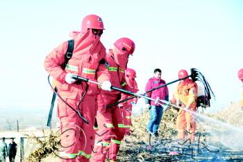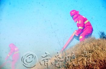 27日,济宁市扑救森林火灾实战演练在邹城市大束镇举行。 当日上午10时15分,大束镇葛炉山林区,巡山护林员发现林区冒起白烟,并可见明火燃烧。护林员随即向镇森林防火指挥办汇报。 由于火场刮起5级东北风,林场多为易燃松柏树种,火借风势迅速向山顶蔓延。鉴于火情严重,《邹城市处置重大森林火灾应急预案》和《济宁市森林火灾应急救援预案》相继启动。 十八盘林场等4支消防队先后赶到火场,邹城市10个重点防火镇街道消防队迅速集结。通讯组将火场画面实时传回山下指挥部,森林防火专家组正研判火情。此时,济宁森林消防支队、周边县市消防队伍正在增援路上。 着火点位于山腰处,大型消防车无法驶入,只能靠防火队员携带装备徒步奔向火场。防火队员持灭火弹,从火场下侧接近并散开,递进式向前投放灭火弹。10枚水剂和干粉灭火弹相继爆炸,将火线撕开,防火队员持风力灭火机进入火场,机器的轰鸣声响彻山岭。增援队伍到达火场后,带着水泵喷水枪投入灭火。经多手段联合作业,明火基本被扑灭,仅剩个别余火。防火队员使用高压细水雾灭火装置和二号工具进行彻底清理。 现场还进行了医疗救护演练。一名防火队员腿部受伤,队友在山腰用红旗表明方位。救护人员携带担架、救护箱跑步进入现场,将伤者抬入临时救治点进行治疗。
