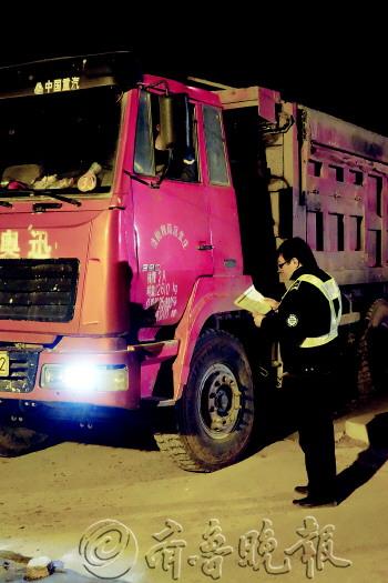 文/片 本报见习记者 魏新丽 一晚200多车次,每车都要监管 米丰功,槐荫区一名渣土监管员,负责监督吉尔西苑工地的渣土运输。11月30日凌晨两点半,记者来到吉尔西苑工地。按照规定,渣土车必须在晚上9点以后运输。因此,万籁俱寂之时,工地上却热火朝天,不时有装满渣土的大车从工地驶出。 米丰功穿着厚厚的制服,站在工地出入口,对驶出的渣土车不间断抽查。天冷,没戴帽子也没戴手套,脸冻得有些发白。 “这个工作就是要在户外作业,一站一晚上,习惯了,就不觉得多冷了。”面对这样的生活,米丰功已经习以为常。戴眼镜,微胖,话不多,31岁的米丰功从事渣土监管员的工作还不到一年。 米丰功说,吉尔西苑正在进行土方作业,挖槽期会产生大量渣土,晚上渣土运输非常繁忙。这个工地共出入30多辆渣土车,一晚上能运200多车次。采访中,大约五分钟就能有一辆车驶出。米丰功说,下半夜车已经少了,上半夜更密集,还会出现压车。 米丰功的工作,主要就是检查这些渣土车是否合乎规范。“封闭盖没盖,扣十分;装载过多、封闭不严,扣五分。还要检查它们是不是准入车辆、是否有通行证。另外,门口的保洁情况、路面扬尘情况也得监督。” 不过,对于这些车辆,米丰功并不会每辆都拦下来检查。一旁的槐荫区渣土监管员夜班巡查组队长王可说:“监管员对工地上的车辆都很熟悉,看一眼就知道这车是不是这里的。” 每晚工地200多车次,都要从米丰功眼皮底下过,每辆车都得看一眼,合不合格由米丰功把关。王队长说:“这个活,虽然不费体力,但费精力,熬人。”