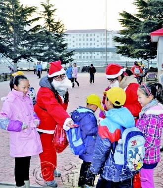 25日,威海市塔山小学英语组的老师们扮演的圣诞老人来到校门口,为这里的老师孩子们送上糖果等节日礼物。