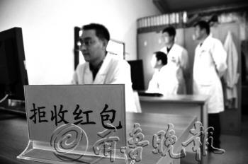 不准收受回扣、不准收受“红包”……近日,济宁市第二人民医院专门召开会议,要求医院医务人员严格遵守“九不准”,严格规范医药购销、办医行医行为,医院与中层干部、普通职工签订责任书,自觉接受监督。图为医院科室挂出的“拒收红包”公示牌。 本报记者 李岩松 通讯员 朱国涛 摄
