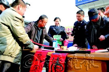 1月23日上午,禹城市公安局组织交警、消防、治安等社区六进单位的书法爱好者,与邀请来的书法家在高新区花园社区为居民写春联、送祝福。 本报记者 董传同 通讯员 马勤贤 摄影报道