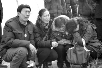 24日,在追思会上,崔山连续资助三年的学生蒋凤美和父亲,从家里赶来,跪在崔山遗像前久久不起。 本报记者 张伟 摄