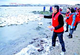 如果说此时此刻的美景愉悦了每名员工的身心,那么奉献爱心则是此行的最终目的。来到现场后,员工们将早已准备好的玉米粒投放在水边,天鹅在喝水时便能发现食物。
