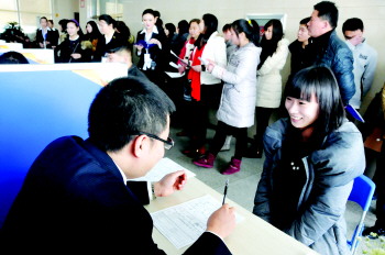 排队等待一个小时后,小于和小郑进入招聘大厅,认真填写完求职登记表,两人耐心地等待着工作人员叫号随即进行初轮面试。“我应聘会计岗位,期望薪酬在3000元左右,希望两年的工作经验能给我增加一些砝码。”捏着手中的号码牌,虽然前面还有近200人等待,小郑已经有一丝期待和紧张,不停地向面试区张望。