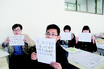 “同学你好,我在xx节有课,你可以到我的课桌上学习。”在烟台大学六教的一间教室里,四张桌子上贴着写有这样话语的卡。这几张桌子是烟大大三学生闫振旭、袁玉倩、王德涛和赵新悦在这学期开学时占到的座位。