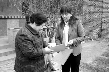 3月7日,李秀莲(右)将一些资料送到村民手中。