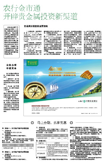 去年农业银行正式推出金市通——代理上海黄金交易所贵金属业务,该业务是农行以上海黄金交易所金融类会员身份,接受与农行签订《中国农业银行代理上海黄金交易所贵金属交易业务协议书》客户的委托,代理客户在上海黄金交易所内进行贵金属交易、资金清算和实物交割并收取相关费用。
