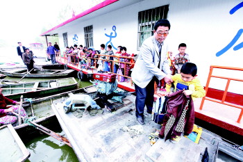 ▲放学了,王升安将孩子一一送上船。