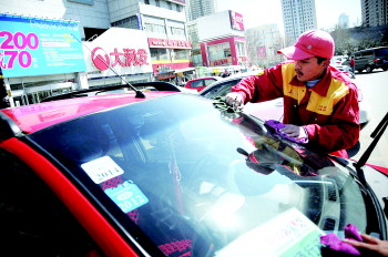 20日,在百盛南门停车场,洗车师傅正在给顾客洗车。朱师傅说,这种洗车为快捷美容,通常他们会根据顾客时间来接单,顾客可以在逛街的时间将车停放在停车场,由师傅来给洗车,朱师傅说,一天最少接到十单生意,很多人选择这种方式,省时便捷。