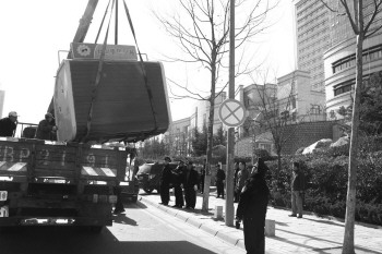 20日,在合肥路齐鲁医院门前,城管执法人员指挥吊车将一处违法早餐亭吊离。据了解,该路段有部分游商浮贩占路经营,求诊者出入医院常被挤到车行道上。当日,市北城管在该路段吊离两个占路亭体,取缔游商浮贩十余人次,为出入医院让出道路。