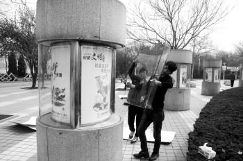 3月25日,明月湖风景区内,工作人员正在安装创文明城市宣传海报。据了解,景区内共更换与创文明城相关的海报、文明规范100余块。 本报记者 马志勇 摄