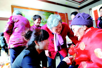 ▲16日,孔张氏老太太过百岁生日,来贺寿的亲戚握着她的手开怀大笑。