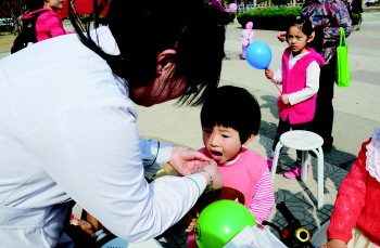 小朋友免费试尝维c含片。 本报记者 姜文洁 摄
